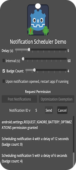 var res = $NotificationScheduler.create_notification_channel( NotificationChannel.new() .set_id("my_channel_id") .set_name("My Channel Name") .set_description("My channel description") .set_importance(NotificationChannel.Importance.DEFAULT)) - Build & schedule notification: