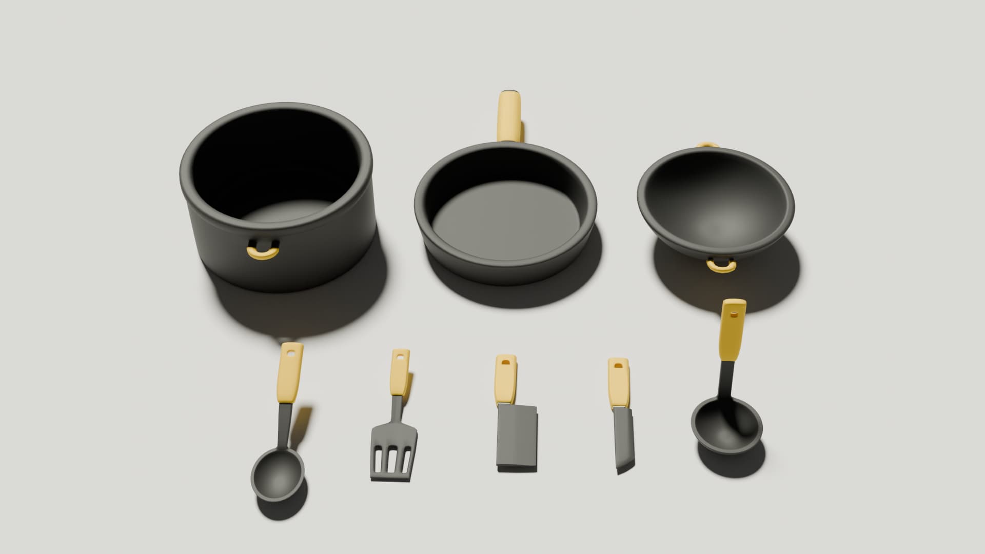 Mini Kitchen Pack featuring essential cooking utensils and cookware, optimized for games. Ideal for mobile, stylized, and VR/AR projects