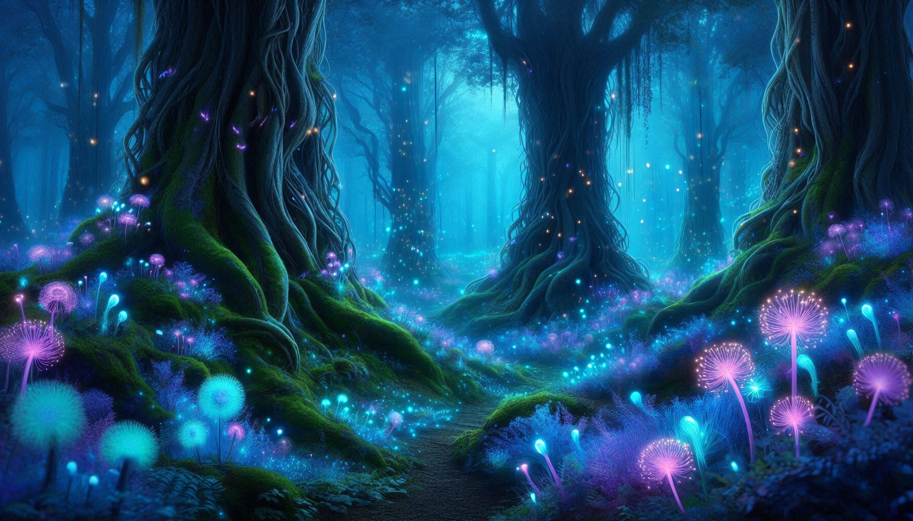 "A dreamlike, mystical forest scene at night, where towering ancient trees with gnarled, twisting roots rise from a forest floor blanketed in glowing turquoise and violet moss and flowers. The entire landscape is illuminated by vibrant bioluminescent