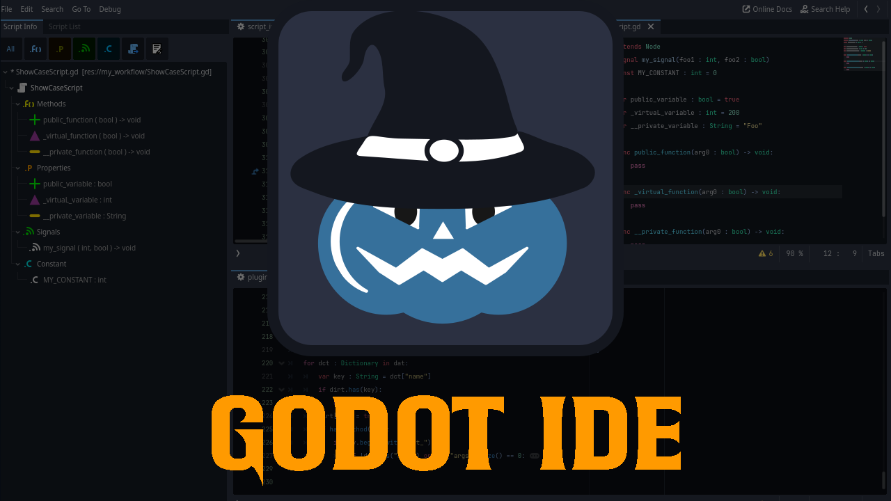 A script editor plugin for Godot 4.4+. Adds top tabs, outline panel, better navigation, and customizable styling. Based on Script-IDE by Marius Hanl