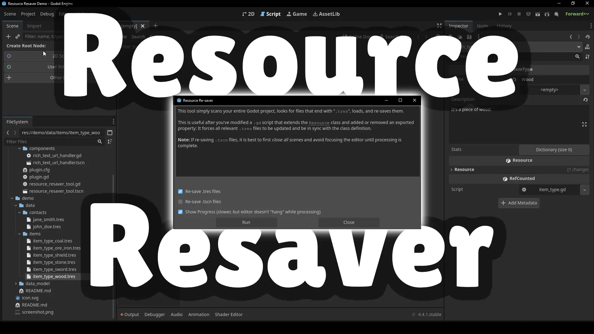 The Resource Resaver is a small Godot addon that automatically re-saves all `.tres` resource files in your project. It's designed to keep your serialized resource files up-to-date after making changes to the associated `.gd` resource scripts