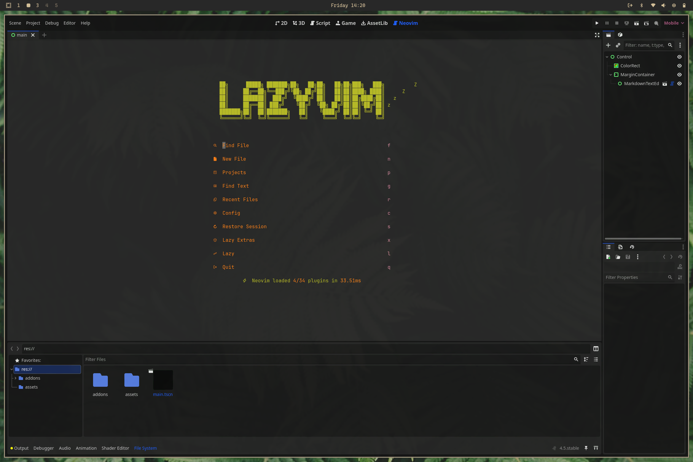VimDot - Neovim Embed for Godot Bring the full Neovim experience directly into the Godot editor. This addon exposes a main-screen tab that hosts a Neovim session, letting you keep your modal editing habits, plugins, and colorschemes while developing