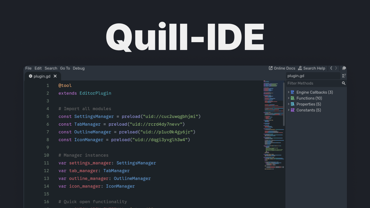 Quill-IDE for Godot A modern, feature-rich script editor for the Godot Engine (4.4+). Quill IDE is a heavily modified fork of the original Script-IDE plugin by Marius Hanl, rebuilt for style, usability, and modularity. Think of it as Godot's Script Editor