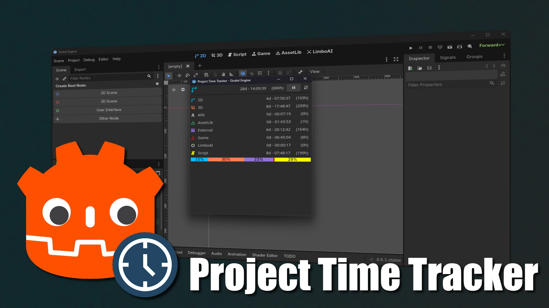 Project Time Tracker A small editor widget which provides basic functions for tracking your time with the Godot editor. Track which main screen view you are using the most. Features Track the time you have spent since the start of your project Track the