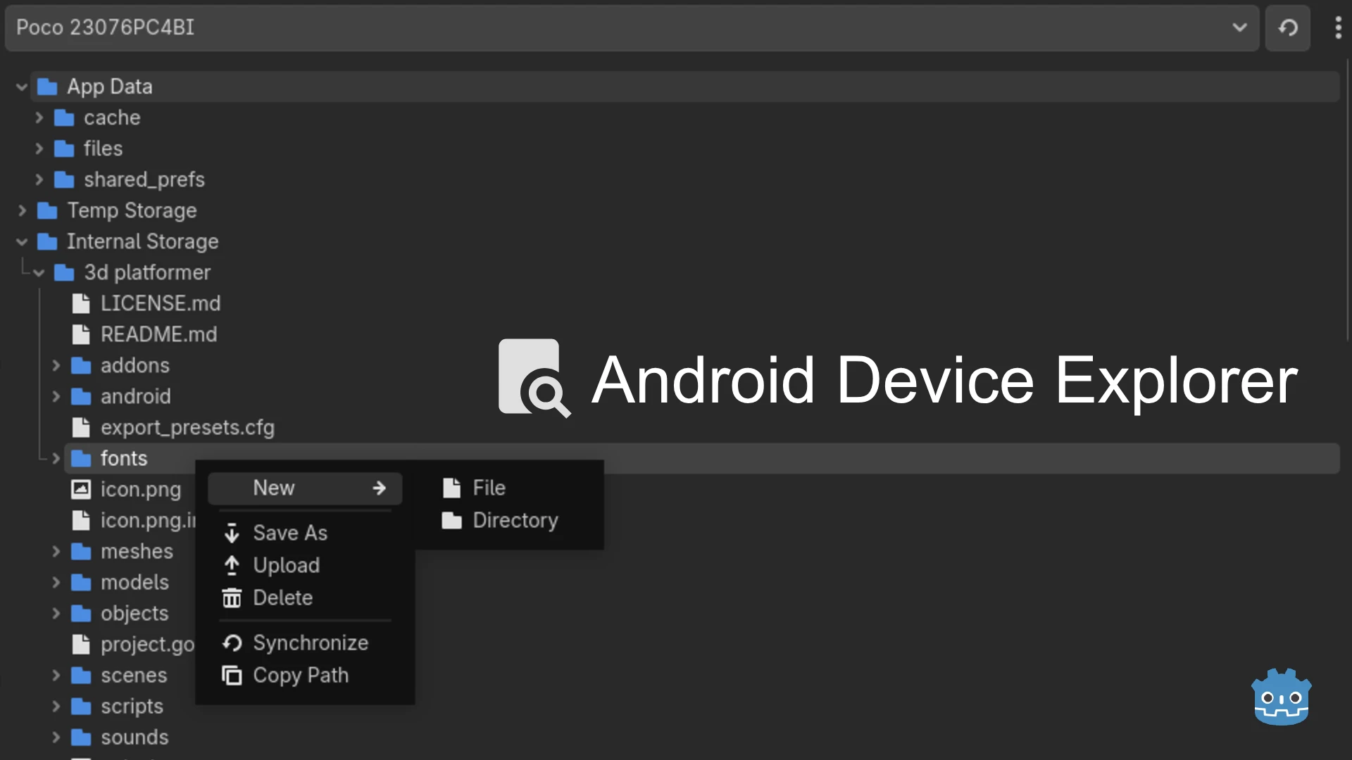Android Device Explorer An editor plugin for Godot that lets you explore and manage the filesystem of connected ADB devices directly from within the editor. Example Use Cases Inspect logs or cached data generated by your app Quickly push test files into