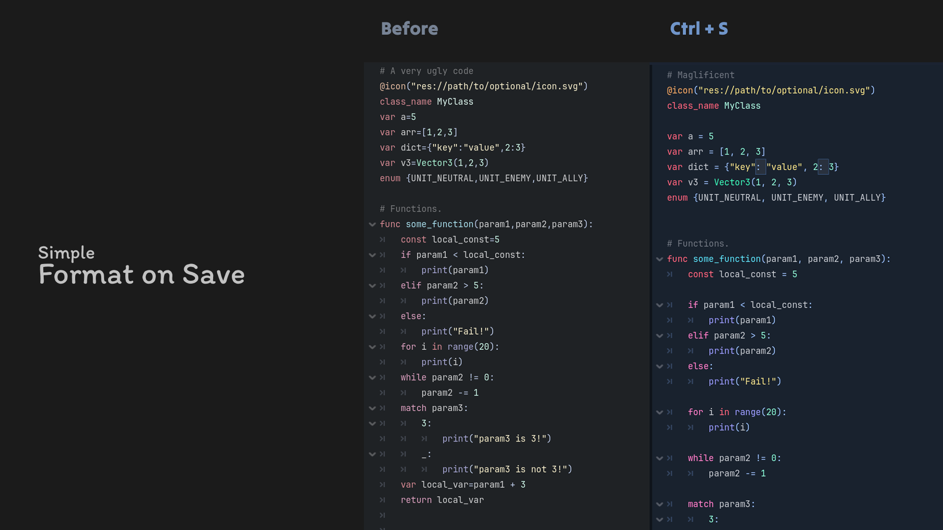 🌠Simple Format On Save A Godot add-on that automatically formats GDScript whenever you save it. Features Does not require gdtoolkit Automatic code formatting when saving files Clean and consistent code style Zero configuration, lightweight and simple to