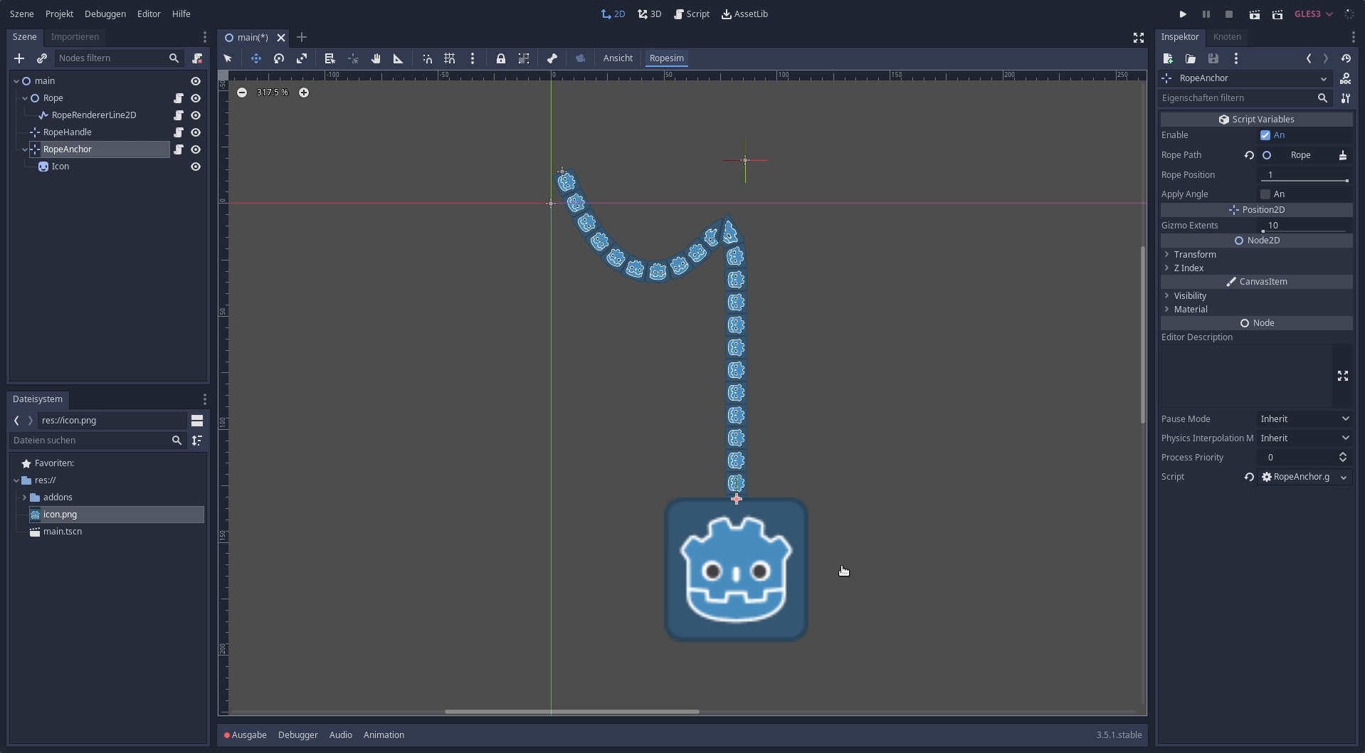 A fast 2D verlet integration based rope simulation for Godot 4.3+. The computation-heavy simulation part is written in C++ using GDExtension, the rest in GDScript. This allows for fast processing and easy extendability. Features: Easy setup and usage Fast