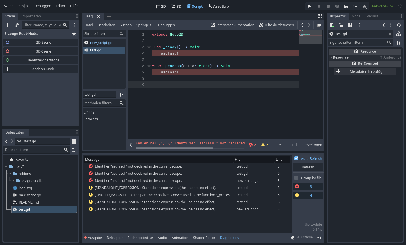 An editor plugin that provides project-wide diagnostics for GDScript files. It tracks every GDScript file in the project and gathers all errors and warnings in a global list