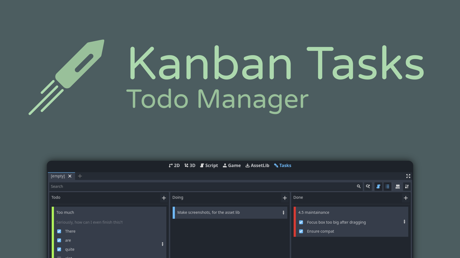 Kanban Tasks - Todo Manager is a minimalistic kanban board application aimed at solo developers. It is available as Godot addon or as standalone application. 🚀 Features Tasks with detailed description and title Intuitive drag and drop usage Fully