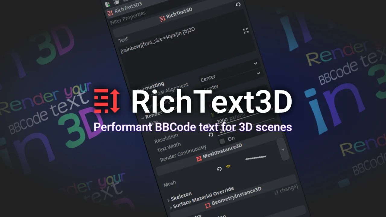 RichText3D: A performant 3D BBCode renderer for Godot. Features Can be added from the Create Node and similar menus. Renders BBCode in real time into a 3D plane. Supports all standard BBCode rendering features, such as [color] , [b] , [i] , [img] , [table