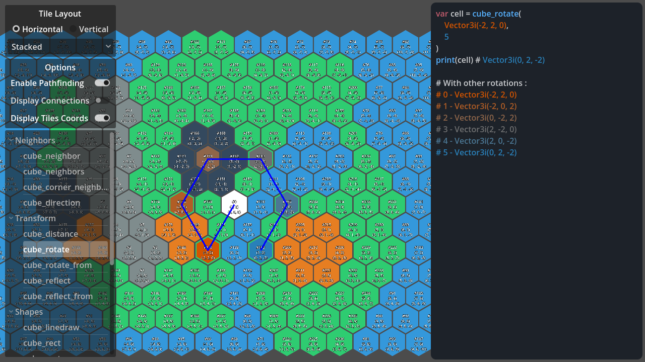 Godot Hexagon TileMapLayer Set of tools to use hexagon based tilemap in Godot with A* pathfinding and cube coordinates system. Require Godot 4.4+, for 4.3+ use version 1.0.1 or earlier Features A* pathfinding support Cube coordinates system Conversion